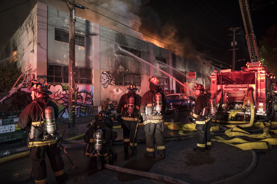 “To recap, the Artist Colony at the Hunter’s Point warehouse known to its residents are ‘The Demon’s Feast’ became involved in a fire alarm fire just two hours ago. Firefighters are on the scene and continuing to fight the blaze. The cause of the fire is unknown at this time, but it is believed chemicals stored there caused the numerous explosions that have kept firefighters limited to the first floor…”