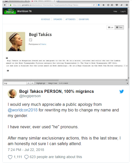 So I think what we have here is a whole lot of people feeling threatened and responding with anger. In fact, in response to (apparently) being “misgendered,” Bogi Takács tweeted: