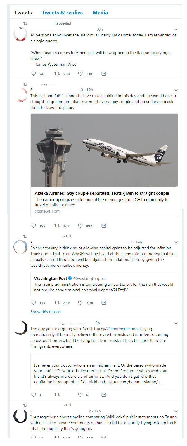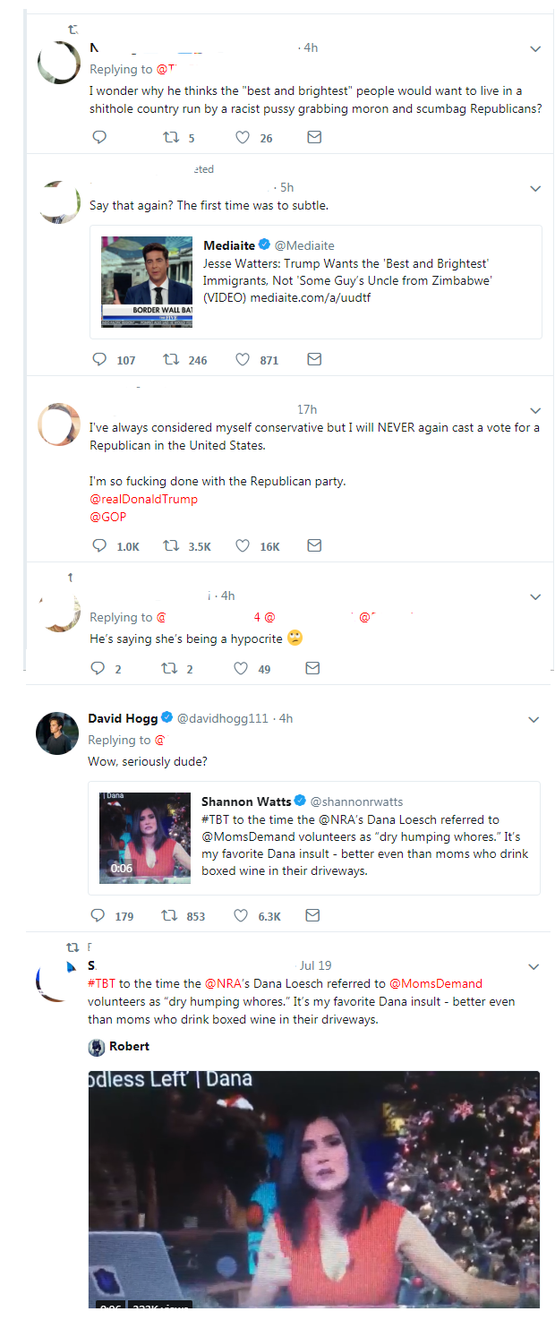 None of the people who addressed me have their tweets hidden, so I thought I’d take a look at what else they had to talk about. I wanted a wider understanding of the individuals involved. To that end, I’m posting screen captures of a few tweets of two of these people while doing my best to hide their identities (except for David Hogg’s since he seems to thrive on publicity).