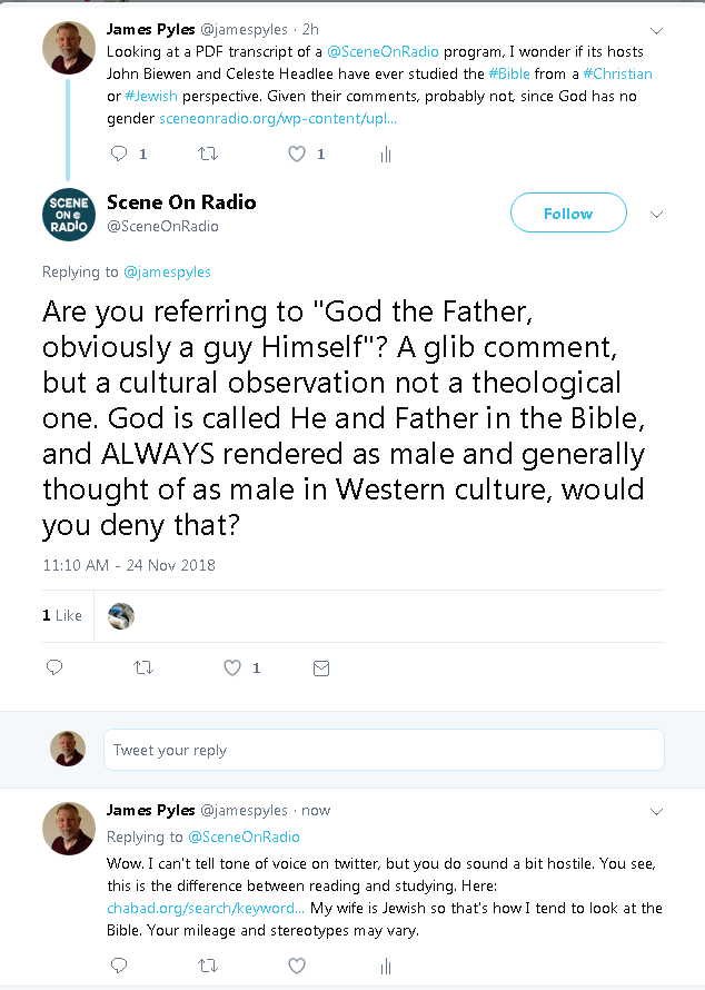 I started writing this blog post because John Biewen showed what I interpreted as gross ignorance of the subtly and depth of the Bible, particularly the Jewish perspectives on the Almighty. Apparently though, Odessa (or @Vitaherbalist) is very politely asking me to actually listen to the “MEN” and “Seeing White” podcast series. I’m impressed that this person is being so even handed in addressing me (Biewen certainly wasn’t). I may have to revise my opinions about twitter somewhat.
