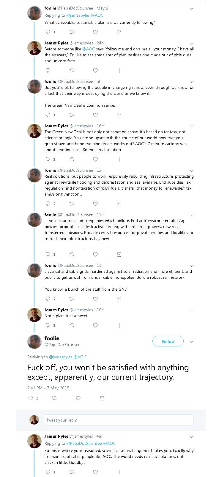 Sorry. Bit of a rant. It’s not like I don’t believe human beings need to do a much, much better job at being stewards of our planet, I just don’t feel like being railroaded into a plan (and having to pay for it whether I agree or not) that has zero practical details and no feasibility based on somebody else’s feelings. To be fair, “foolie” had no hope of convincing anyone based on a series of tweets because you can’t communicate complex scientific datasets in a series of textual “sound bytes.” I was hoping this fellow had a few URLs leading to some hard data that might shine a light on something more practical. Alas, all of his responses were pretty limp as you’ll see below: