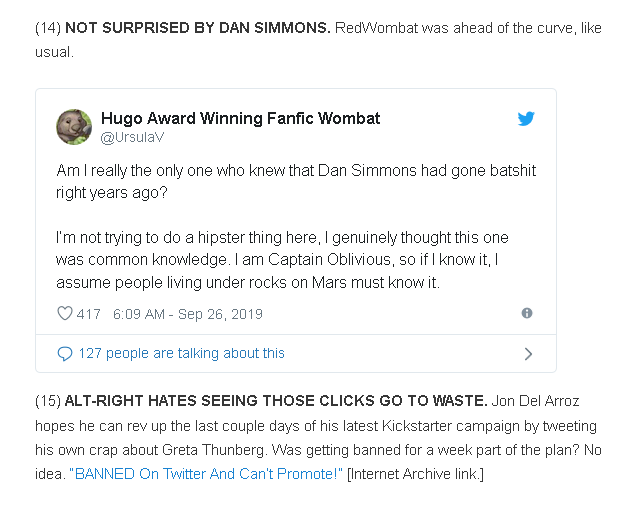 Switching topics slightly, I’d never heard of Dan Simmons before this File 770 commentary, but I guess he’s guilty of criticizing teenage environmentalist and climate change icon Greta Thunberg.