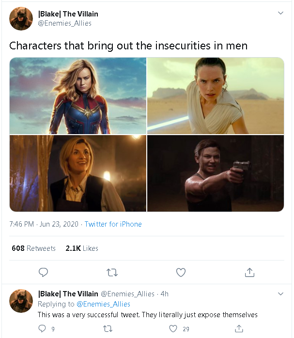 One person responded saying that the universally liked characters were in better quality movies while another said that the liked females didn’t “hijack tropes that usually belong to men, that’s why men don’t have a problem with them. Rey and Cap Marvel and others took the role males characters usually get, dethroning the male. Hence the rage.”