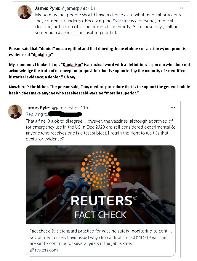I just had an interesting “debate” on twitter. Someone I follow (and who doesn’t follow me) said something about the vaxx-denier at work being on again about the person in question getting vaccinated.