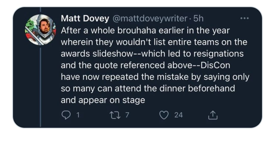 I won’t bother quoting it since I’ve supplied the link and since the write up is very small. You can read it for yourself. It doesn’t say much more than the Hugo Awards admin team released a statement on twitter announcing their resignation. It doesn’t explain why they quit but this screenshot from twitter may provide a tiny bit of insight.