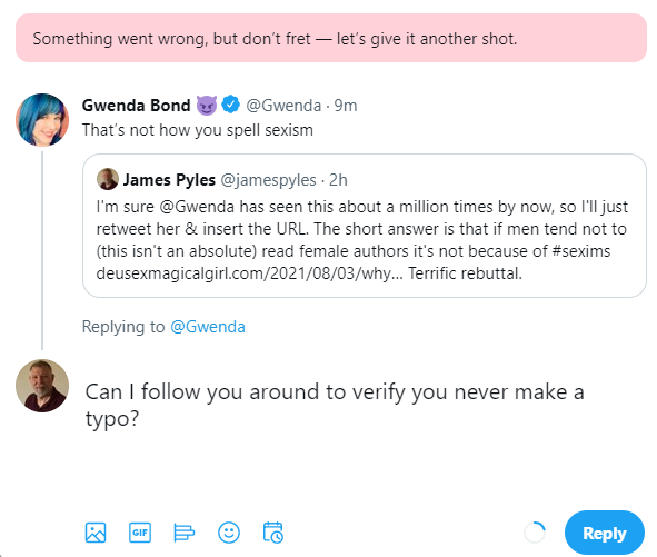 As I was collecting images for this post, I noticed Bond had replied to me, pointing out that I misspelled “sexism” (I made a typo). When I went to respond, I discovered she blocked me. Basically a cheap shot, but sometimes a cheap shot is better than no shot at all.