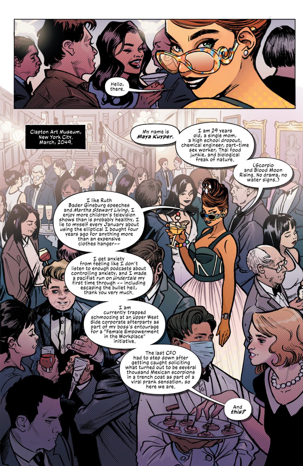 We could use this as a textbook example of bad writing. First, it abuses the comic-book medium by dropping a wall of text into a single panel. Second, it delivers a character’s life story as a checklist. Third, it delivers a character’s life story on the first page before we have a reason to care. Fourth, it reads like a Twitter profile. Fifth, it’s full of desperately trendy how-do-you-do-kids bullshit. Sixth, it’s condescending as hell, so condescending that the artist even gave the character a smug expression to go with the monologue. Seventh, it’s overwhelming—and overwhelmingly shallow—in its brand of feminism.