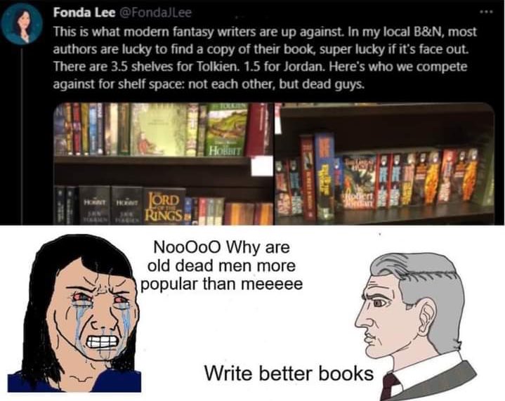 This also relates to fantasy writer Fonda Lee’s complaint on twitter that she has to compete for space on bookstore shelves with dead male writers.