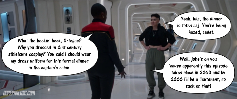 Meanwhile, aboard the Enterprise, Uhura has been invited to join the senior staff in the Captain’s quarters for dinner. Ortega advised her to show up in dress uniform, but when she arrives, Uhura discovers that everyone is dressed very casually, including the Captain. In fact, dress is so casual, that Ortega looks like the 23rd century version of a “homie in the hood” complete with belly button reveal. On an actual Naval vessel, even if dress for an event were casual, it wouldn’t be that casual.