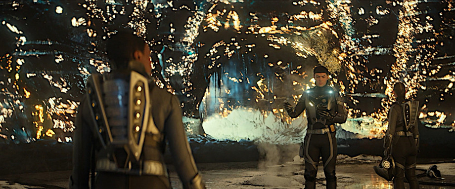 Kirk, as impatient as his younger brother but not as lucky, approaches the egg and is electrocuted. Now we discover that they must be inside the structure, because they can take Kirk’s helmet off. Suddenly communications is lost and the transporter lock is broken. The comet put up its shields again. La’an is able to set Kirk’s suit to use its defibrillator since Sam’s heart has stopped.