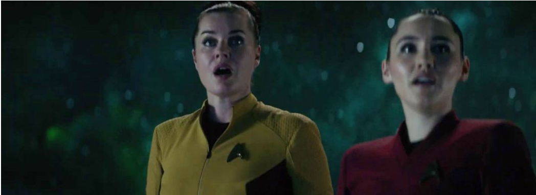 Pike, Spock, and Admiral April (Adrian Holmes) are meeting to discuss how to approach the negotiations with the Rongovians. Surprisingly, stunningly, Uhura’s role there is to take notes like she’s a yeoman. That’s basically a “secretary” or “clerical role” which is a throwback to the 1960s and earlier. Given that “NuTrek” is supposed to be progressive and empowering to woman of color, I was fairly surprised. There was absolutely no other reason for her presence. Celia Rose Gooding might as well have sat this episode out.