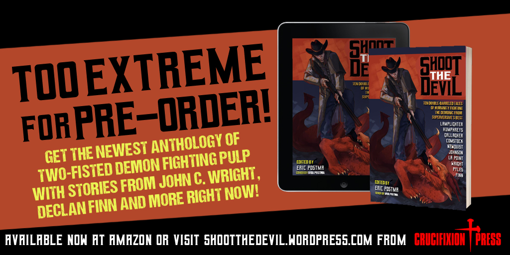 It wasn’t supposed to come out until October 1st, but the anthology was just “too extreme for pre-order.” Available on Amazon right now in both digital and paperback the Crucifixion Press anthology Shoot the Devil: Ten Tales of Humans Defeating the Demonic. The Amazon blurb says: