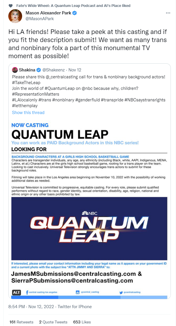 Addendum – November 16, 2022: I was curious about who issued the original casting announcement for the “girls basketball” episode and found that the person who made it is a staff writer and two-time director for the current Quantum Leap. Reading back into Shakina’s twitter timeline even before the new show debuted, it seems like the events I described above have been planned from the very start. The representation imperative is not just periodic but an ongoing theme for the entire series, much like how we now understand Star Trek: Discovery. Conclude from that what you will.