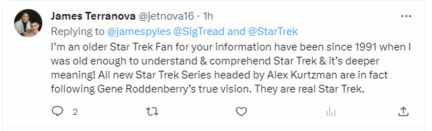 I did have a “spirited discussion” with a “true Star Trek fan” on twitter (or X) and he believes that A) the Studio owning Star Trek defines Star Trek and someone named Chris Gregory defined Star Trek in his book Star Trek: Parallel Narratives. He further stated that Kurtzman and company are following Gene Roddenberry’s “true vision.” That was after I pointed out Roddenberry had problems even with most of the ST movies and The Next Generation before he died.
