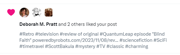 Addendum: November 9, 2023 – Deborah Pratt, producer of the original Quantum Leap and the current show “liked” the tweet I posted on twitter/X promoting this review. I know it doesn’t sound like much, but I’m appreciative. I just hope she visited my blog and read the review.