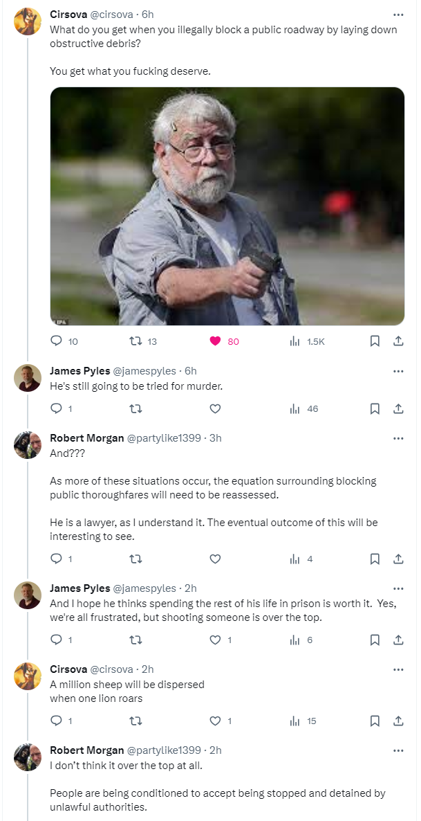 In the case of Mr. Darlington, was his, and by extension, our frustration worth it? Is the exasperation of people whose lives have been disrupted by environmentalists blocking roads and interfering with our lives worth shooting and killing two of these activists?