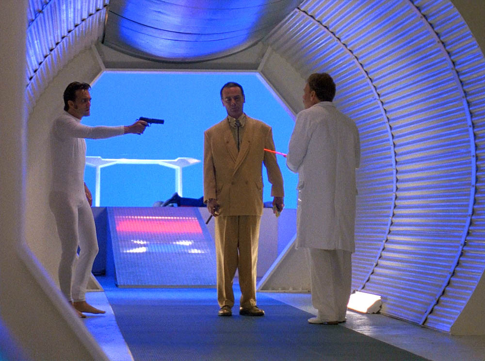 Scene from the original Quantum Leap episode “Killin’ Time” featuring (L-R) Cameron Dye (Leon Stiles), Dean Stockwell (Al Calavicci), and Dennis Wolfberg (“Gooshie” Gushman).