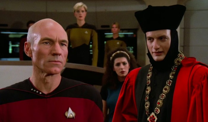 But before that, she promises the kid he’ll be taken care of and get to see Mom often. But as she goes to another room to get the kid’s teddy bear, he boosts her comm badge and uses it to escape the city into a sandstorm (I wonder how the kid lived through that?).