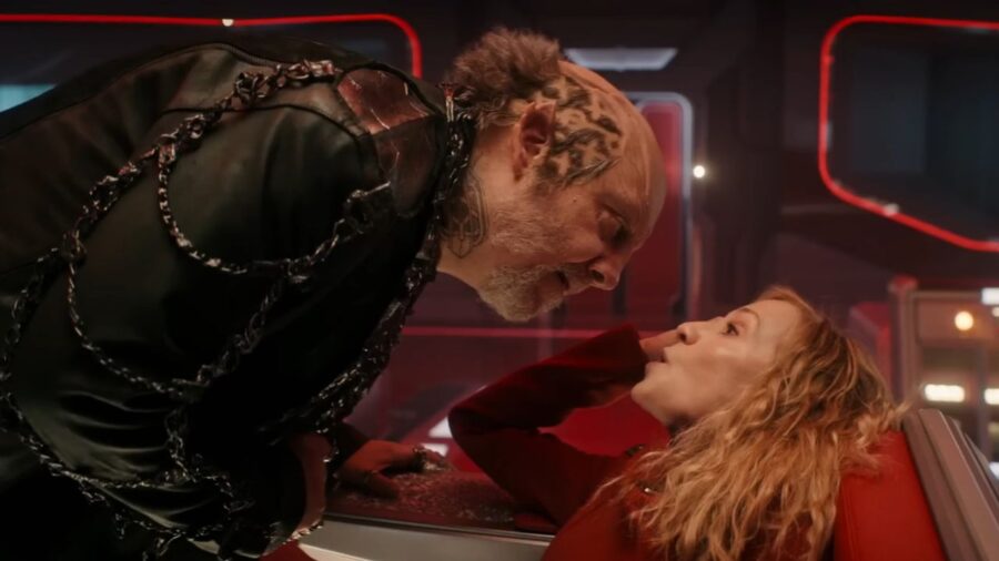 I know Thok is a half-Klingon and half-Jem Hadar warrior and acts as the Marine Drill Instructor of the show, but she’s still a tremendous pain in the ass. Instantly after having a hunk of metal removed from her side and going through a painful cauterization of her wound, she yells in victory and hits her Klingon “nurse” Jay-Den Kraag (Karim Diane), knocking him across the room from sheer enthusiasm. Still more bad writing.