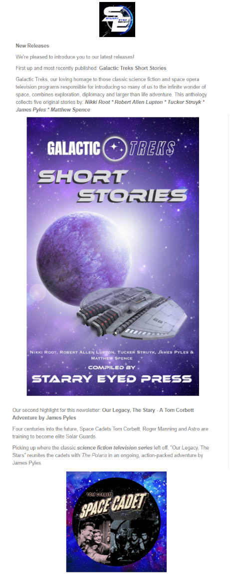 I used a recent Starry Eyed Press newsletter to craft the composite image you see above. I’m sure you can tell this is all about self-promotion. When you’re an indie author, you are also your own marketing department.