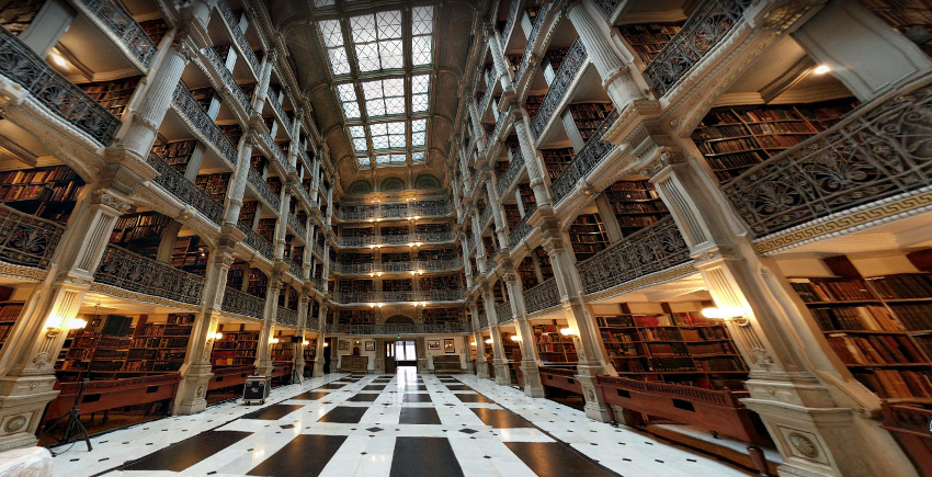 Today, the Pegman takes us to the Peabody Institute of Johns Hopkins University. Of course, I looked it up, but it wasn’t until I paid more attention to the image above and imagined myself standing in the middle of that library that I got my “hook, or rather part of it.”