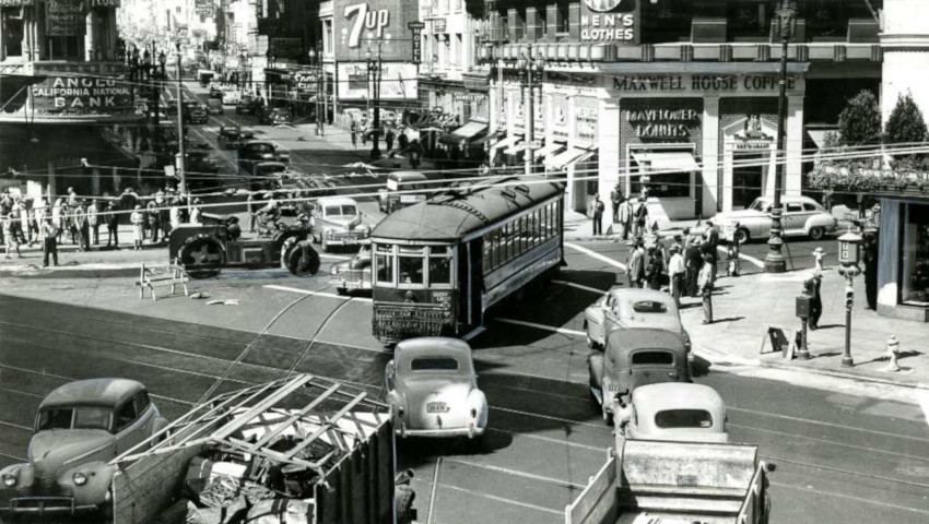San Francisco Chronicle Archives – From the back of the photo: “F Car goes through – The two months long blockade of the Fourth and Market intersection ended completely yesterday morning as F cars moved from Fourth Street across Market into Stockton. While police officers experimented with the new traffic pattern at the complex five-way intersection, workmen rolled down the last of the fill in the project. City officials hope the revised schedule will end one or more downtown bottlenecks.” September 9, 1947.
