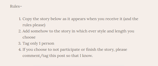 Sadje tagged me to continue (or in this case, finish) A Special Finish the Story Challenge for Nov started by “The Haunted Wordsmith.” Here’s the story as crafted by the various contributors.