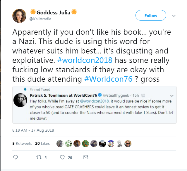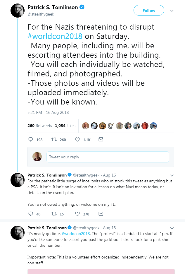 Part of the inspiration for crafting this essay comes from fellow blogger Joy Pixley’s report of her attending WorldCon 76. She had a pretty good time, and in my discussions with her, she didn’t see any (or at least not much) evidence of bias at WorldCon. However, she did notice a number of Christians and religious Jews in attendance, and no one mobbed, beat, harassed, or otherwise attacked them for their faiths.